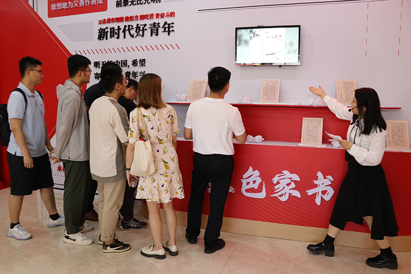 “紅色家書”互動墻前,一封封“紅色家書”通過數(shù)字智能互動技術(shù)播放,團(tuán)員青年們駐足閱讀,認(rèn)真聆聽,追憶革命先輩家國情懷,體悟感受信仰力量。