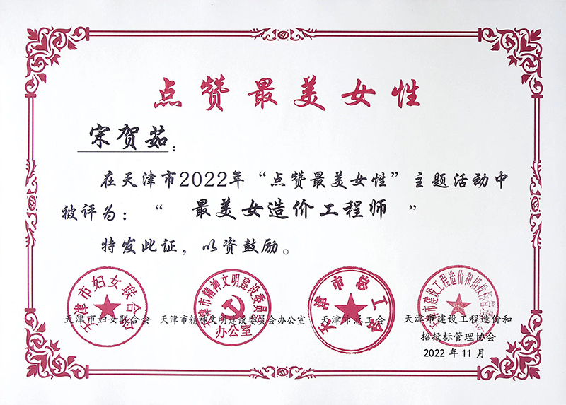在“三八”國(guó)際勞動(dòng)?jì)D女節(jié)到來(lái)之際,從天津市泛亞工程咨詢(xún)有限公司傳來(lái)喜訊:在市婦聯(lián)、市文明辦、市總工會(huì)、津價(jià)招協(xié)聯(lián)合開(kāi)展的天津市2022年“點(diǎn)贊最美女性”主題活動(dòng)中,泛亞公司造價(jià)三部部門(mén)經(jīng)理宋賀茹榮獲“最美女造價(jià)工程師”稱(chēng)號(hào)。