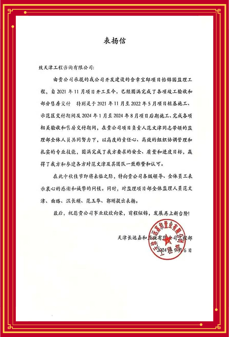 津濱輕軌9號線信號系統更新改造工程項目部感謝監理團隊多舉措解決項目施工作業接口復雜、改造期間運能不降、新舊系統無縫切換等難題,力保施工、運營“雙安全”;天津長遠嘉和置業有限公司贊賞含璋寶坻項目怡錦園項目監理團隊以高度的責任心、高效的組織協調管理和扎實的專業技能推動項目圓滿完成;天津華勘穂金房地產開發有限公司感謝監理項目部主動對接業主需求,有效管控質量安全,切實保障施工進度,很好地履行監理職責......